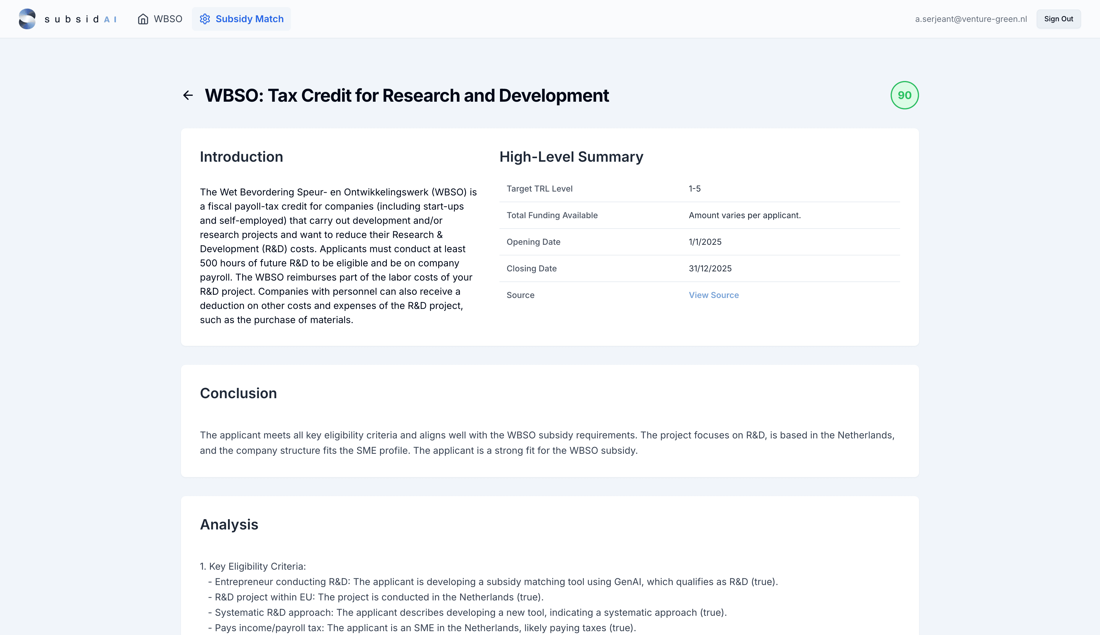 Ons AI-systeem analyseert uw documenten en koppelt ze aan onze Europese subsidiedatabase. Ontvang snel een gedetailleerd overzicht van geschikte subsidies, gepresenteerd in een begrijpelijk formaat.