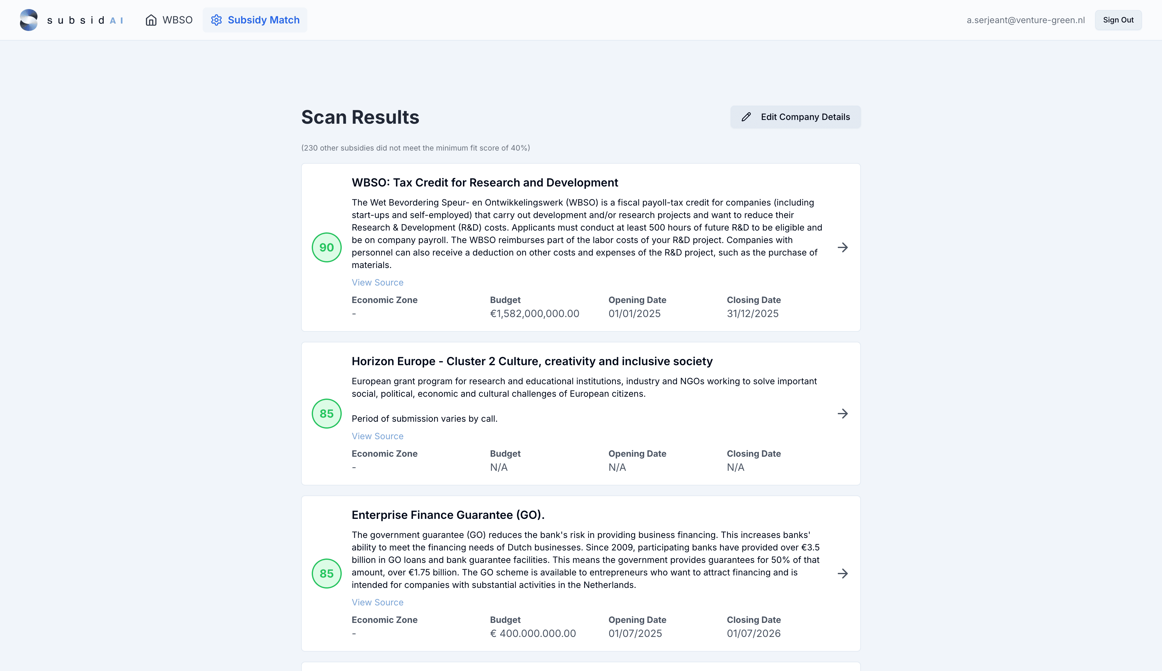 Vul onze uitgebreide vragenlijst in en ontvang binnen minuten een subsidie-geschiktheidsrapport. Ons AI-platform koppelt uw bedrijf aan honderden financieringsmogelijkheden via grants, belastingvoordelen en industrieprogramma's—waardoor uren onderzoek worden weggenomen terwijl uw kansen op optimale financiering worden gemaximaliseerd.