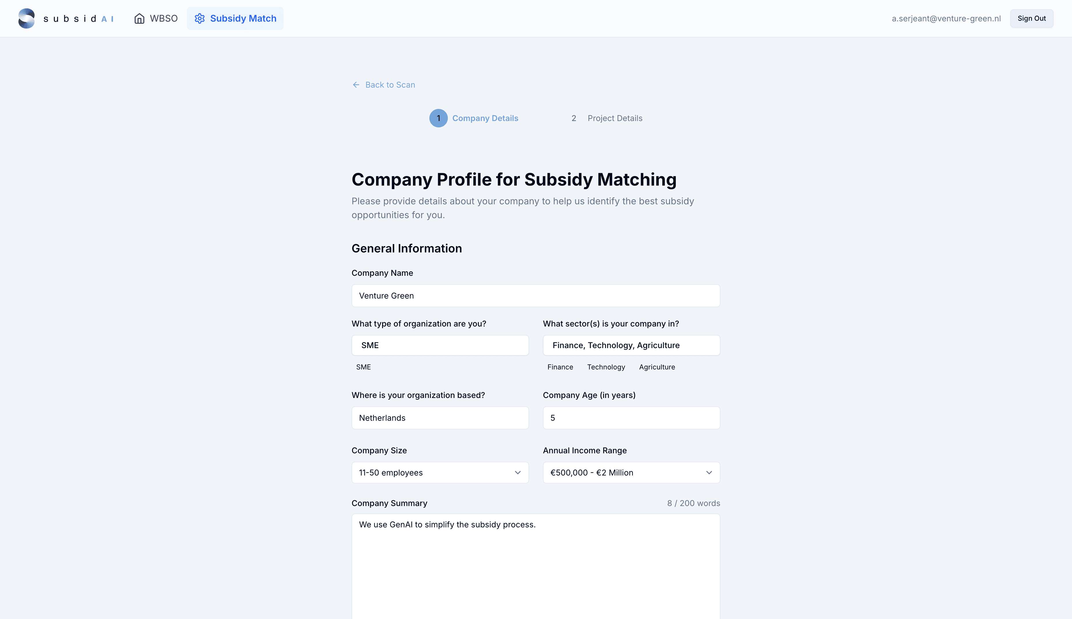 Deel uw bedrijfsdetails via onze intelligente vragenlijst. Onze AI begeleidt u door relevante vragen over uw bedrijf, projecten en doelen om een uitgebreid profiel op te bouwen voor nauwkeurige subsidiematching.